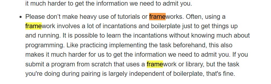 Are frameworks bad? According to The Recurse Center, which is a dope and FREE school I was recommended to learn how to become a better programmer, they are. As part of their instructions for how to prepare for the admission interview, they say this: